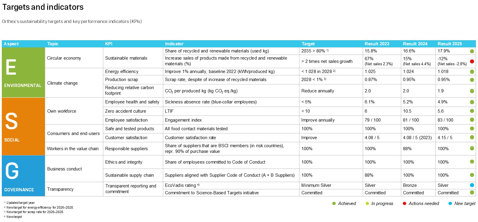 Orthex’s sustainability strategy follows the ESG structure, and it is confirmed annually for a three-year period. Our sustainability strategy for 2026–2028 drives our actions forward and supports us in reaching our ambitious long-term sustainability targets. Based on the findings of the double materiality assessment conducted in 2025, we have streamlined our strategy to focus on topics where our sustainability-related impacts, risks, and opportunities are the most significant. Orthex’s sustainability strategy, relevant sustainability topics and set indicators, targets, and results are illustrated below.