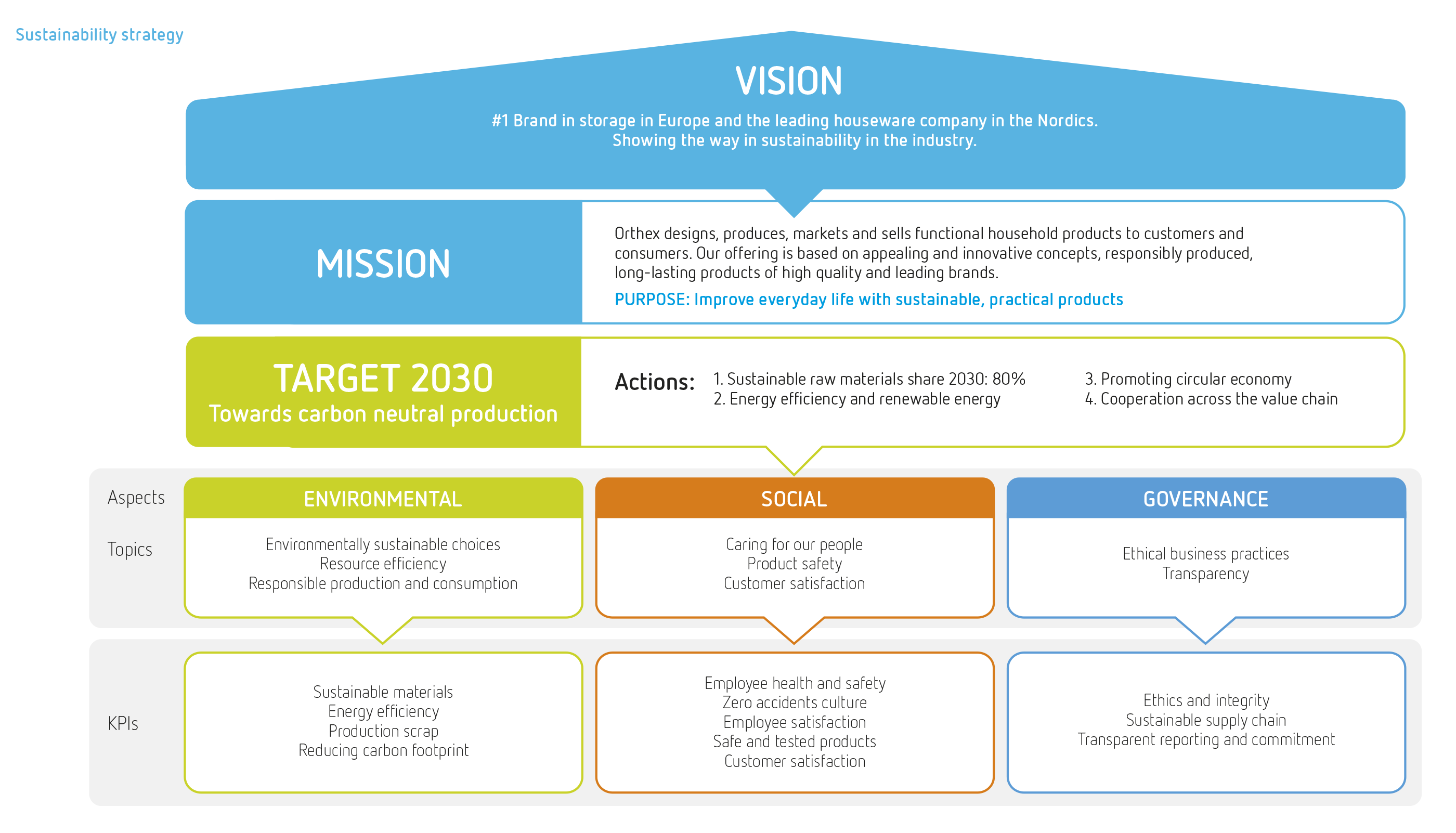 Orthex’s sustainability work and sustainability strategy are based on a stakeholder materiality assessment. Orthex’s sustainability strategy follows the ESG structure and is confirmed annually for a three-year period. In the 2024 sustainability strategy review, no major changes were implemented. Orthex’s sustainability strategy, relevant sustainability topics and set indicators, targets, and results are illustrated below.